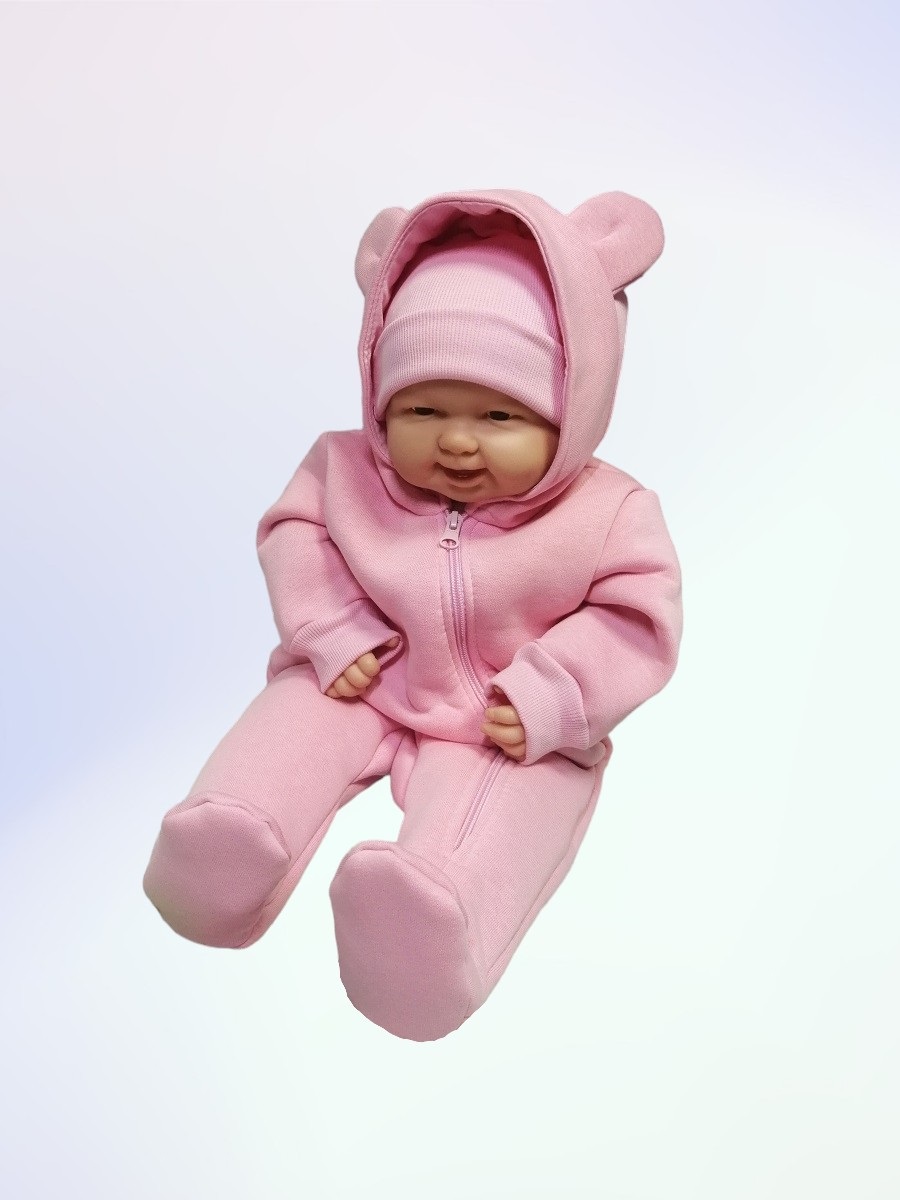 "МоёДитё" комбинезон выполнен из футера с начёсом. Комбинезон с капюшоном на подкладке и декорирован сверху ушками, с закрытыми ножками, рукава на манжетах, спереди косая молния до конца одной ножки. Шапочка из кашкорсе можно одевать как с отворотом, так и без. Очень хорошо тянется.