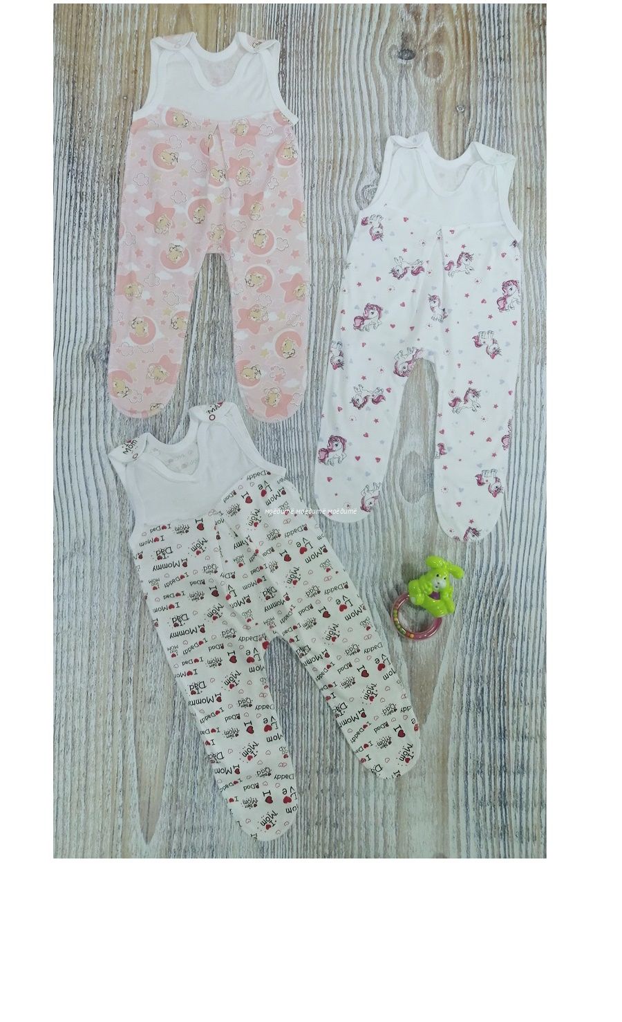 Ползунки выполнены из 100% хлопка (кулирка), сверху на кокетке, на плечиках на кнопочках.
